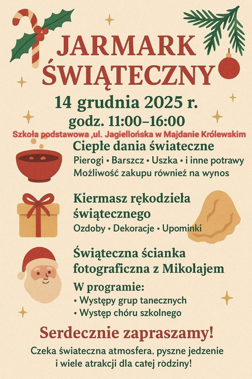 Rada Rodziców w niedzielę 14 grudnia 2025r. w godzinach 11.00 - 16.00 organizuje w naszej szkole przy Jagiellońskiej Jarmark Świąteczny, podczas którego będzie można nabyć pyszne potrawy świąteczne (możliwość zakupu również na wynos), piękne ozdoby świąteczne wykonane przez rodziców, wykonać pamiątkowe zdjęcie z Mikołajem na ściance z tłem świątecznym oraz zobaczyć występy grup tanecznych naszych najmłodszych uczniów oraz występ choru szkolnego. Gwarantowana świąteczna atmosfera. Serdecznie zapraszamy. Szczegóły na plakacie.